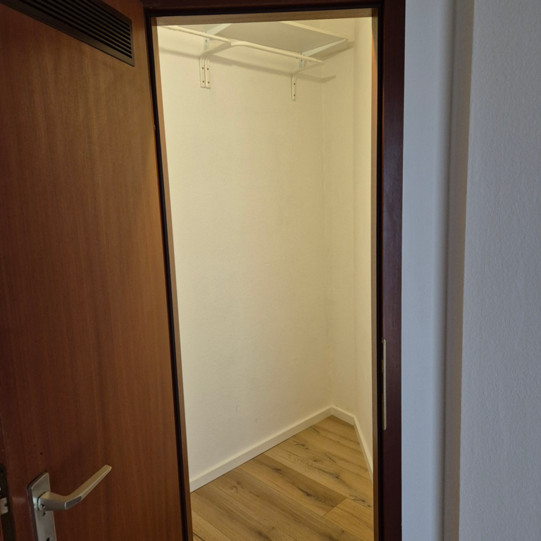 Helles 1-Zimmer-Appartement mit weißem Wannenbad und großem überdachten Balkon in Westausrichtung. Der Wohnbereich ist mit Laminat ausgestattet.
